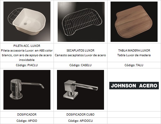 De forma opcional se les puede adicionar a este modelo los siguientes accesorios: Canasto seca platos, canasto para verduras, tabla de madera y dosificador de detergente. Los cuales permiten sectorizarla, brindando las prestaciones de una pileta simple o doble.