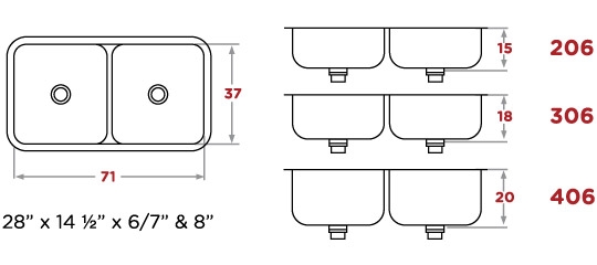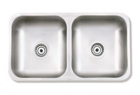 Piletas doble de acero inoxidable bajo mesada. Las diferencias entre los tres modelos es la profundidad.